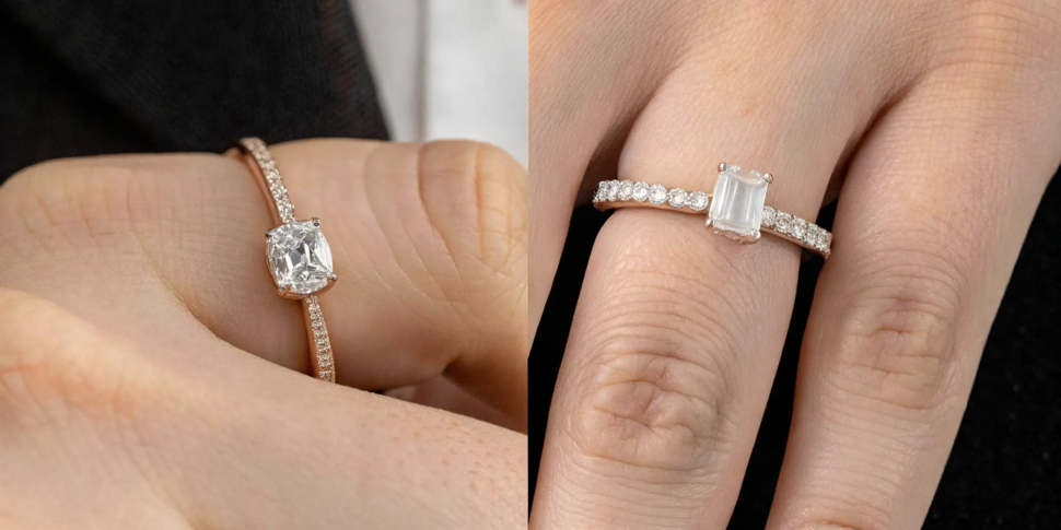The setting is the metal framework that holds your diamond in place, and it has the biggest impact on the ring’s final look. The most classic choice is the prong setting, which uses small metal claws to grip the diamond. These prongs can be rounded, pointed, flat, or V-shaped, each creating a slightly different effect. For a more modern or minimalist feel, you might consider a bezel setting, which encircles the diamond with a thin metal rim. We’re also seeing a lot of creativity in contemporary engagement rings, with bold metalwork, asymmetric designs, and unique east-west stone placements that turn tradition on its head.