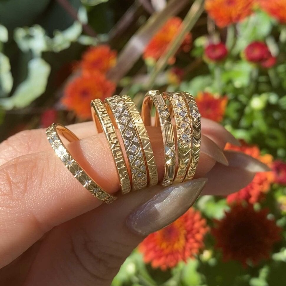 Based in Los Angeles, Sofia Kaman creates jewelry with a romantic, vintage-inspired feel. Her collections are perfect for the bride who loves delicate details, intricate metalwork, and a touch of old-world charm. Each piece feels personal and handcrafted, designed to be a future heirloom. Sofia Kaman’s women's wedding bands often feature beautiful textures, subtle diamond accents, and unique shapes that stack perfectly with a variety of engagement ring styles. If you’re looking for something that feels both timeless and distinctly feminine, her work is a must-see.