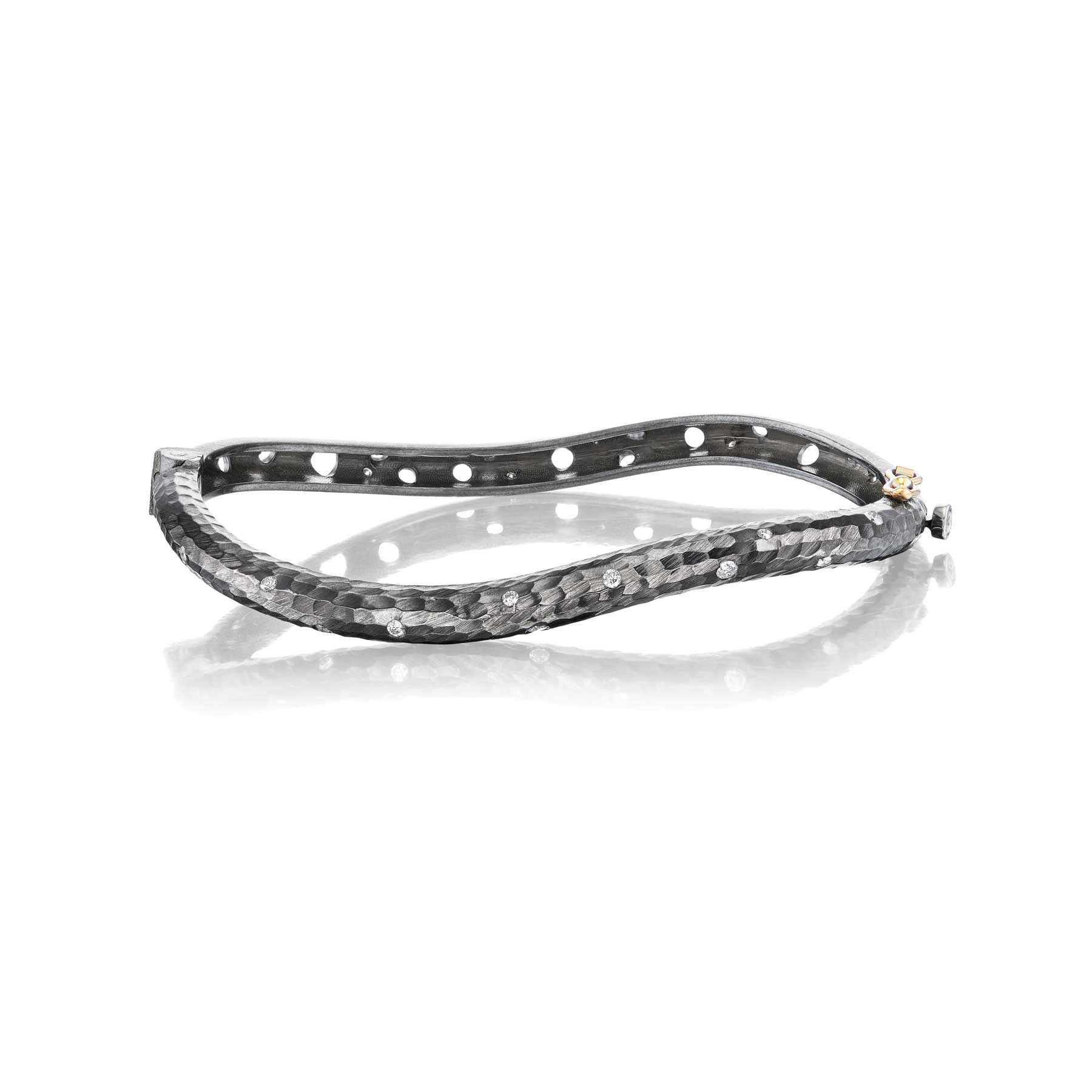 A must-have for any gold lover, this bracelet from Dana Bronfman is elegant with a bit of edge. Its hammered texture and scratch-resistant finish features sprinkled flush-set diamonds. A handmade hinge and safety clasp makes the piece easy to wear.