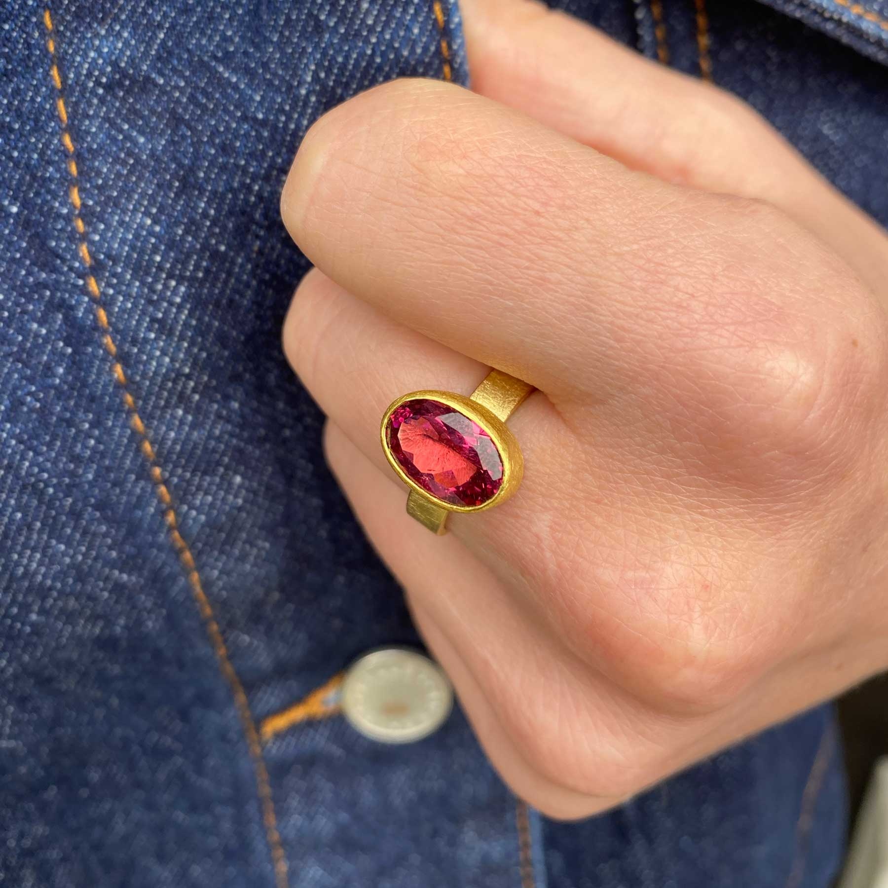 Elegant red and pink three-tourmaline stud earrings by Petra Class. Crafted in 22k and 18k yellow gold, these striking pieces combine vibrant gemstones with luxurious gold for a refined, timeless look.