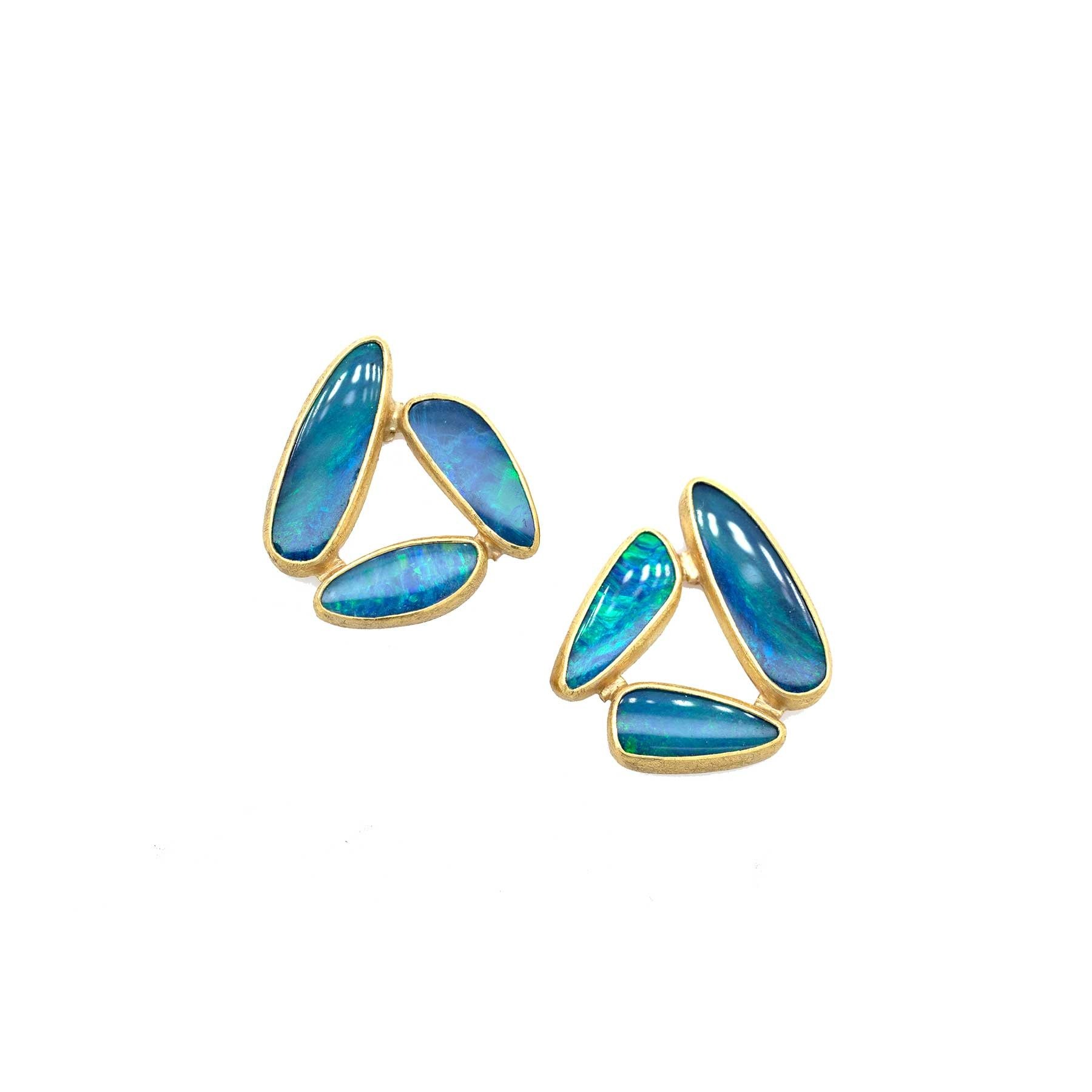 Charming three-opal stud earrings by Petra Class, set in a luxurious 22k yellow gold bezel with 18k gold backing and post. These opal studs feature a subtle, iridescent glow, adding a touch of elegance and timeless beauty to any look.
