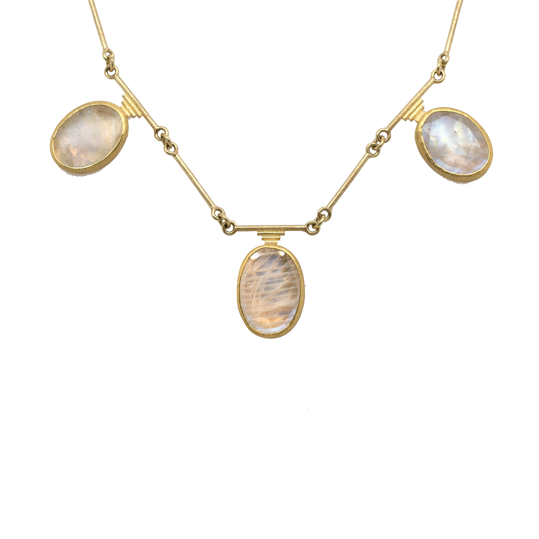 Each faceted moonstone of this Petra Class beauty has a 22k gold frame with a stepped design at the top of the frame. A gold segment chain completes this stand-out necklace.